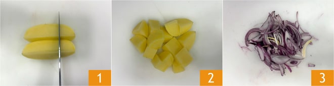 Pour préparer le lapin au micro-ondes, commencez par éplucher les pommes de terre, coupez-les d'abord en quartiers 1 puis en morceaux 2. Émincez l'oignon en julienne 3 et réservez.