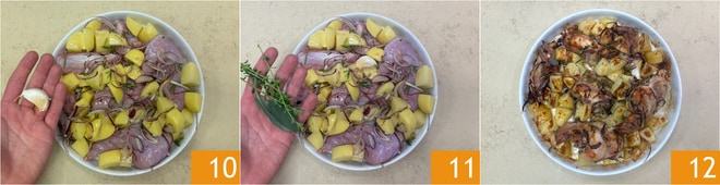 Transférez le tout dans un plat légèrement huilé, ajoutez l'ail 10, le thym et la sauge 11. Faites cuire au micro-ondes à 800 W pendant 40 minutes. Puis continuez la cuisson pendant 10 minutes supplémentaires en mode grill. Le lapin au micro-ondes est prêt à être servi 12.