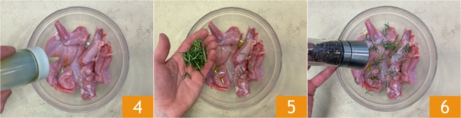 Dans un bol, mettez le lapin en morceaux, ajoutez l'huile 4, le romarin 5, assaisonnez de sel et de poivre 6.