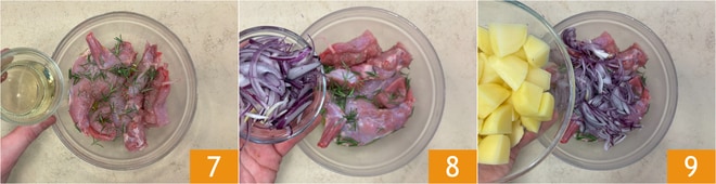 Versez dans le bol également le vin blanc 7 et le bouillon de légumes. Ajoutez les oignons 8 et les pommes de terre 9. Mélangez pour faire imprégner les saveurs.