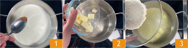Pour préparer les lasagnes au ragoût de lentilles, commencez par la béchamel : versez le lait dans une casserole, ajoutez la noix de muscade 1 et le sel, puis faites-le chauffer. Mettez le beurre dans une autre casserole 2 et faites-le fondre à feu doux, puis ajoutez la farine d'un coup 3.