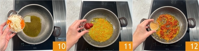 Dans une grande poêle, versez un filet d'huile et le hachis pour le soffritto 10 ; faites rissoler pendant environ 10 minutes, en mélangeant souvent. Ajoutez ensuite le concentré de tomate 11 et le gingembre en poudre 12.