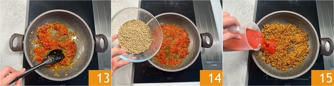 Laissez brièvement imprégner le fond 13 et versez les lentilles 14. Mélangez et couvrez avec la sauce tomate 15, en ajoutant l'eau nécessaire pour couvrir à fleur.