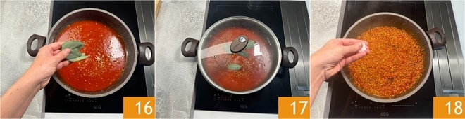 Parfumez avec quelques feuilles de sauge 16, couvrez avec le couvercle 17 et laissez cuire doucement pendant 40 minutes, en mélangeant de temps en temps et en ajoutant de l'eau si nécessaire. Vers la fin de la cuisson, ajustez le sel 18 et le poivre.