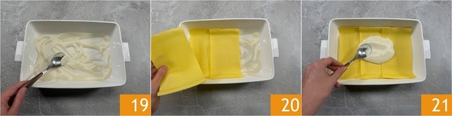 Coupez la provola en tranches très fines et irrégulières et commencez à composer les lasagnes. Dans un plat pour 4-6 personnes, répartissez à la base un voile de béchamel 19, puis continuez avec une couche de lasagnes (3 feuilles, légèrement superposées) 20, continuez avec un voile de béchamel 21.