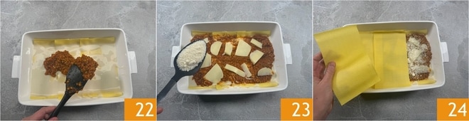Versez dessus une abondante quantité de ragoût 22, un peu de provola et une pincée de parmesan 23. Continuez avec une autre couche de pâte 24.