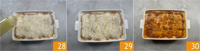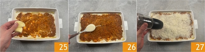 Poursuivez 25 en réalisant un total de 3 couches. Sur la dernière couche, répartissez une abondante quantité de ragoût 26, en évitant la provola, et en ajoutant généreusement le Grana Padano râpé 27. Complétez avec une pincée de poivre 27