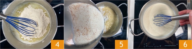 Mélangez avec un fouet à main 4 jusqu'à obtenir un mélange doré. À ce stade, délayez le roux en versant d'abord un peu de lait chaud, puis tout le reste 5. Continuez à mélanger à feu doux jusqu'à ce que la béchamel s'épaississe 6. Réservez-la pour qu'elle refroidisse.