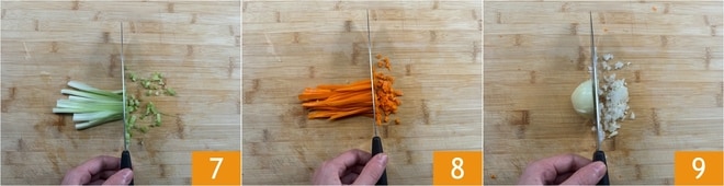 Occupez-vous du ragoût de lentilles : lavez, épluchez et hachez le céleri 7, la carotte 8 et l'oignon 9 pour le soffritto.