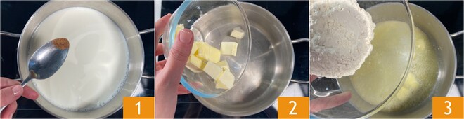 Pour préparer les lasagnes aux blettes, commencez d'abord par la béchamel : versez le lait dans une casserole, ajoutez la noix de muscade 1 et le sel, puis faites chauffer. Faites fondre le beurre à feu doux dans une autre casserole 2. Versez la farine en une seule fois 3.
