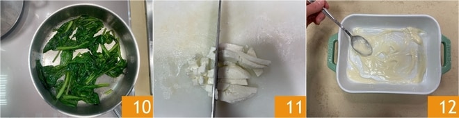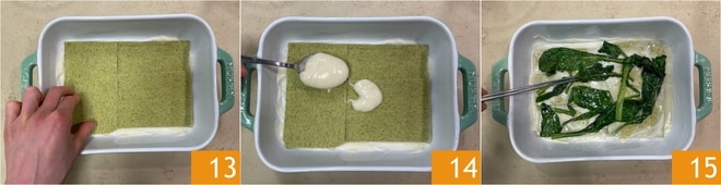 Placez les feuilles de pâte verte 13 puis une autre couche de béchamel 14. Répartissez maintenant une partie des blettes cuites 15.