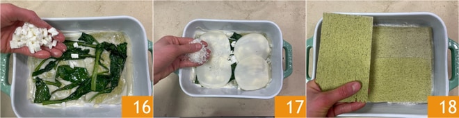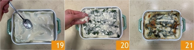 La dernière couche sera composée de béchamel 19, de blettes, de mozzarella et de fromages râpés 20, donc sans provolone. Faites cuire dans un four statique préchauffé à 190° pendant 35 minutes. Sortez les lasagnes aux blettes du four et laissez-les tiédir avant de les servir 21 !