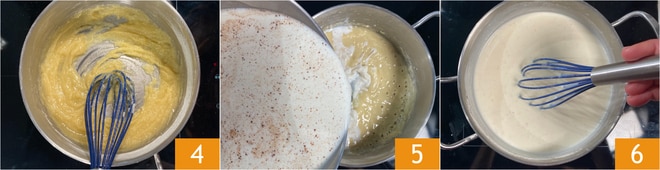 Remuez vigoureusement avec un fouet à main jusqu'à obtenir un mélange doré, le roux 4. À ce stade, diluez le roux en versant d'abord un peu de lait chaud puis tout le reste 5. Continuez de mélanger à feu doux jusqu'à ce que la béchamel ait épaissi 6. Laissez refroidir la béchamel.