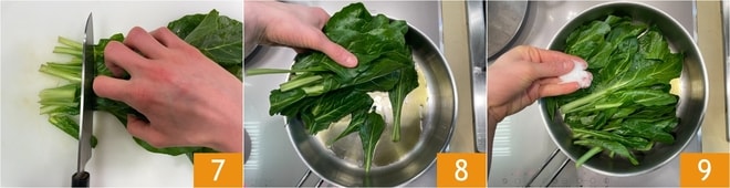 Nettoyez les légumes en coupant la base des tiges 7. Dans une poêle, faites chauffer un filet d'huile, ajoutez les blettes 8 et assaisonnez de sel 9 et de poivre.