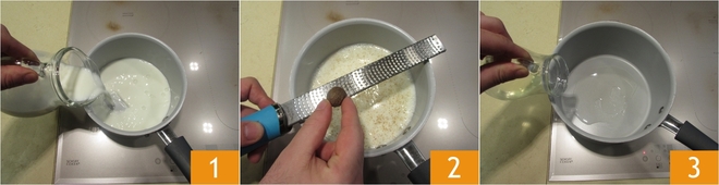 Pour préparer les lasagnes à la poêle, commencez par la béchamel. Versez le lait dans une petite casserole 1, assaisonnez de noix de muscade, allumez le feu et chauffez le lait 2. Dans une autre petite casserole, versez l'huile de graines 3.