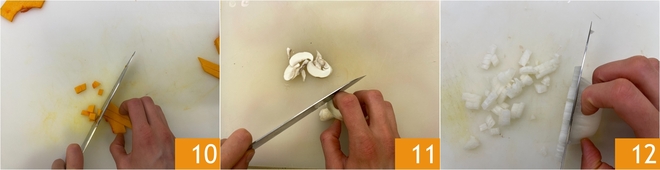 Entre-temps, occupez-vous des légumes. Coupez la courge nettoyée en dés 10, les champignons de Paris en lamelles 11 et hachez l'oignon 12.
