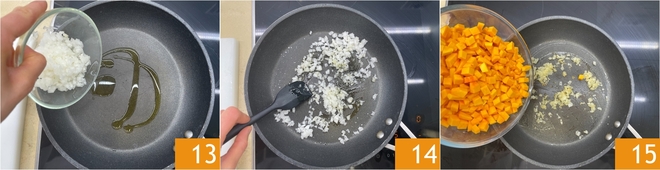 Dans une poêle antiadhésive, versez l'huile d'olive extra vierge et ajoutez l'oignon haché 13. Faites-le revenir pendant deux minutes à feu moyen en mélangeant avec une spatule 14. Ajoutez maintenant les dés de courge 15.