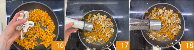 Ajoutez également les champignons de Paris 16, assaisonnez d'une pincée de sel 17 et d'une bonne pincée de poivre noir 18. Faites cuire pendant 7 minutes et réservez.
