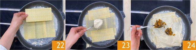 Commencez à disposer les feuilles de pâte 22, versez une couche de béchamel 23 et ajoutez la garniture d'oignon, de courge et de champignons 24.
