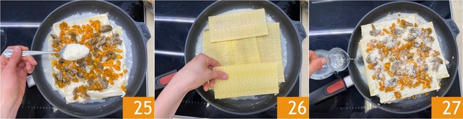 Maintenant, saupoudrez la surface de la première couche avec du Parmigiano râpé 25 et continuez en ajoutant une autre feuille, en créant au total trois couches 26. Versez l'eau restante sur les côtés de la lasagne composée 27.