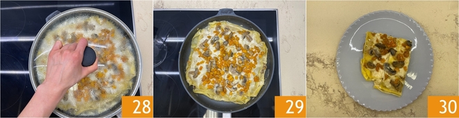 Fermez avec un couvercle et faites cuire à feu doux pendant 25-30 minutes, en vérifiant qu'elle ne sèche pas trop 28. Une fois la cuisson terminée, laissez reposer les lasagnes à la poêle sans couvercle et à feu éteint 29. Servez vos lasagnes à la poêle encore chaudes 30.