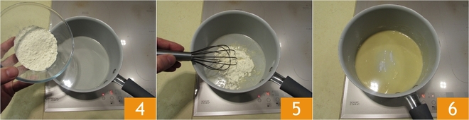Ajoutez la farine à l'huile chaude 4 et commencez à mélanger avec un fouet 5. Après deux minutes de cuisson, vous obtiendrez une consistance homogène semblable à un roux, mais plus clair 6.