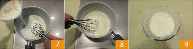 Versez le lait chaud en filet et commencez à cuire la béchamel en mélangeant avec un fouet 7. Continuez à épaissir jusqu'à ce que la béchamel frôle l'ébullition 8. Une fois épaissie, transférez-la dans un bol couvert de film alimentaire 9.