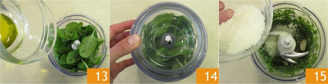 Occupez-vous maintenant du pesto : placez les feuilles de basilic, lavées et séchées, dans un mixeur avec l'huile 13 et mixez pendant quelques secondes 14, puis ajoutez la gousse d'ail, le Parmigiano Reggiano DOP et le Pecorino râpés 15.