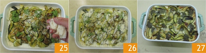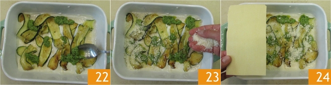 Disposez 3 feuilles de pâte en les chevauchant légèrement 19, puis recouvrez avec encore un peu de béchamel 20 et ajoutez des courgettes 21.