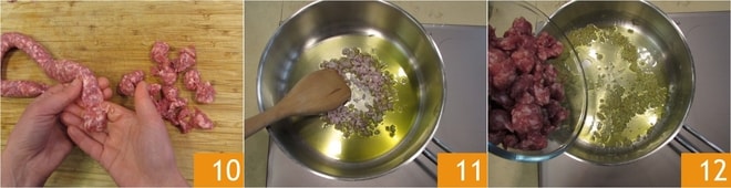 Retirez la peau de la saucisse et réduisez-la en morceaux avec les mains 10. Versez un filet d'huile dans une grande casserole et faites revenir l'échalote à feu doux 11. Versez la saucisse dans la casserole 12 et faites rissoler quelques minutes.