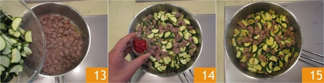 Ajoutez les courgettes 13, ajoutez le concentré de tomate 14, salez, poivrez et faites cuire environ 8-10 minutes à feu moyen. Une fois ce temps écoulé, éteignez le feu et réservez 15.