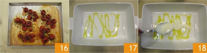 Entre-temps, les tomates cerises seront bien rôties 16. Prenez un plat à four de 20x30 cm, versez un filet d'huile au fond 17 et une cuillère de béchamel 18