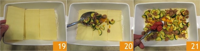 Disposez maintenant 3 des 12 feuilles de pâte sèche 19 et recouvrez avec une partie de la sauce de saucisse et courgettes 20. Répartissez également les tomates cerises dessus 21.