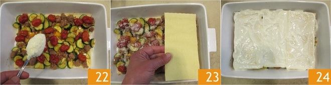 Assaisonnez avec une cuillère de Grana râpé 22. Continuez avec une autre couche de pâte, béchamel, tomates cerises et Grana. Continuez jusqu'à épuisement des ingrédients 24; avec ces doses, vous obtiendrez 4 couches au total.