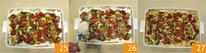 La dernière couche devra être constituée de béchamel, de sauce aux courgettes et saucisse, tomates et Grana 26. Faites cuire dans un four préchauffé à 200° pour 25 minutes. Une fois cuites, sortez les lasagnes avec courgettes, tomates confites et saucisse du four et laissez-les tiédir avant de servir 27.