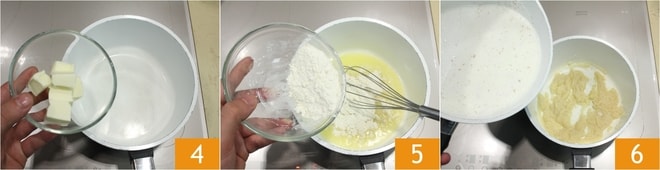 À part, faites fondre le beurre à feu doux 4, puis éteignez le feu et ajoutez la farine d'un coup 5, en mélangeant avec un fouet pour éviter la formation de grumeaux. Remettez à chauffer à feu doux et mélangez jusqu'à obtenir une couleur dorée. Incorporez le lait chaud 6 et faites cuire 5-6 minutes à feu doux.