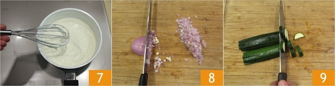 Continuez à mélanger avec le fouet jusqu'à ce que la béchamel ait épaissi 7. Maintenant, occupez-vous de la sauce : hachez finement une échalote 8, lavez et coupez les courgettes en deux dans le sens de la longueur, puis tranchez-les avec une épaisseur d'environ 1 cm 9