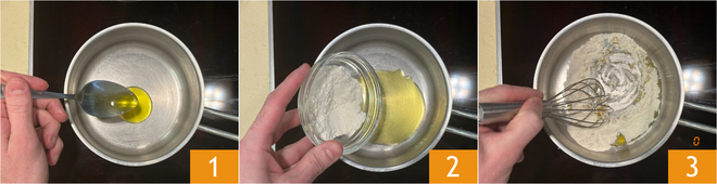 Pour préparer les lasagnes crevettes et pistaches, commencez par la béchamel à l'huile : dans une casserole, chauffez l'huile 1, puis ajoutez la farine 2. Mélangez et formez le roux, en le laissant dorer pendant 1-2 minutes 3.