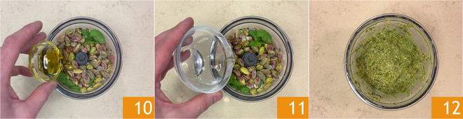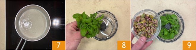 Une fois prête, couvrez la béchamel avec un film plastique en contact et mettez de côté. Occupez-vous du pesto de pistaches 7 : dans le mixeur, mettez les feuilles de basilic nettoyées 8 et les pistaches 9.