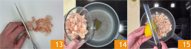 À ce stade, occupez-vous des crevettes : hachez-les grossièrement avec un couteau 13, puis faites-les revenir à la poêle avec un filet d'huile pour quelques instants 14. Parfumez avec le zeste de citron 15.