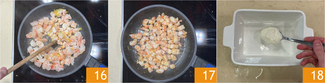 Mélangez pour assaisonner 16 et éteignez le feu dès que les crevettes auront changé de couleur 17. Vous êtes prêts à assembler les lasagnes : au fond d'un plat de 20x16 cm, répartissez un peu de béchamel 18.
