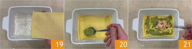 Disposez la première feuille de pâte 19, puis étalez un peu de pesto de pistaches 20 et ajoutez les crevettes 21.