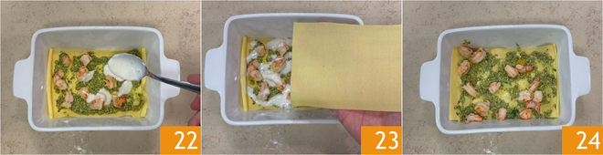 Parsemez un peu de béchamel 22, puis continuez avec une autre feuille de pâte 23, du pesto de pistaches, des crevettes 24 et de la béchamel. Continuez ainsi jusqu'à épuisement des ingrédients 24.