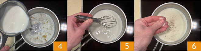 À ce stade, versez le lait chaud 4 et continuez de mélanger avec le fouet sur le feu jusqu'à ce que la sauce épaississe 5. Assaisonnez avec de la muscade et du sel 6.