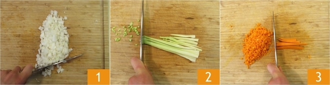 Pour préparer les lasagnes montagnardes, commencez par le ragù de saucisse : épluchez et hachez finement l'oignon 1, le céleri 2 et la carotte 3.