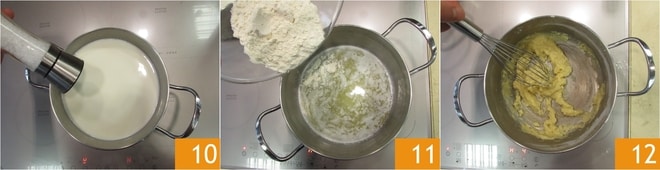 Pendant ce temps, préparez la béchamel : dans une casserole, portez le lait à ébullition avec une pincée de sel 10. Faites fondre le beurre dans une autre casserole, ajoutez la farine en une seule fois 11. Remuez énergiquement avec un fouet pour éviter la formation de grumeaux. Continuez à remuer jusqu'à obtenir un mélange doré 12.