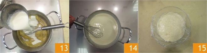 Versez un peu de lait chaud 13, remuez, puis versez le reste du lait. Faites cuire la béchamel pendant environ 5-6 minutes 14 jusqu'à ce qu'elle épaississe. Conservez à température ambiante et couvrez avec un film plastique au contact 15.