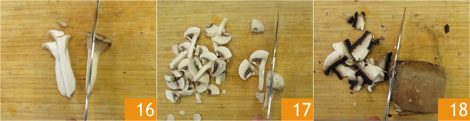 Préparez les champignons : nettoyez les champignons en grattant la partie la plus terreuse avec un couteau. Coupez les girolles en tranches 16 et faites de même avec les champignons de Paris 17 et les portobellos 18.