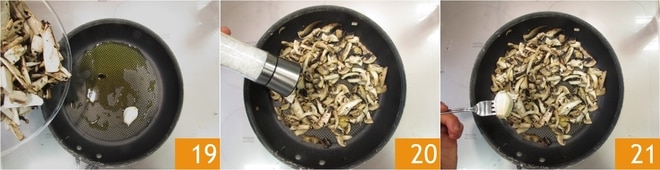 Faites chauffer un filet d'huile d'olive dans une grande poêle. Ajoutez la gousse d'ail, faites-la revenir pour parfumer. Ajoutez les champignons 19 et faites-les sauter à la poêle pendant 2-3 minutes, ou jusqu'à ce qu'ils soient cuits. Salez 20, retirez la gousse d'ail 21.