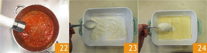 Le ragù sera également prêt 22, ajustez le sel. Prenez un plat rectangulaire (dimensions 24 x 17 x 6), mettez une première fine couche de béchamel 23, disposez dessus 3 feuilles de pâte légèrement superposées, ajoutez une couche de béchamel 24.